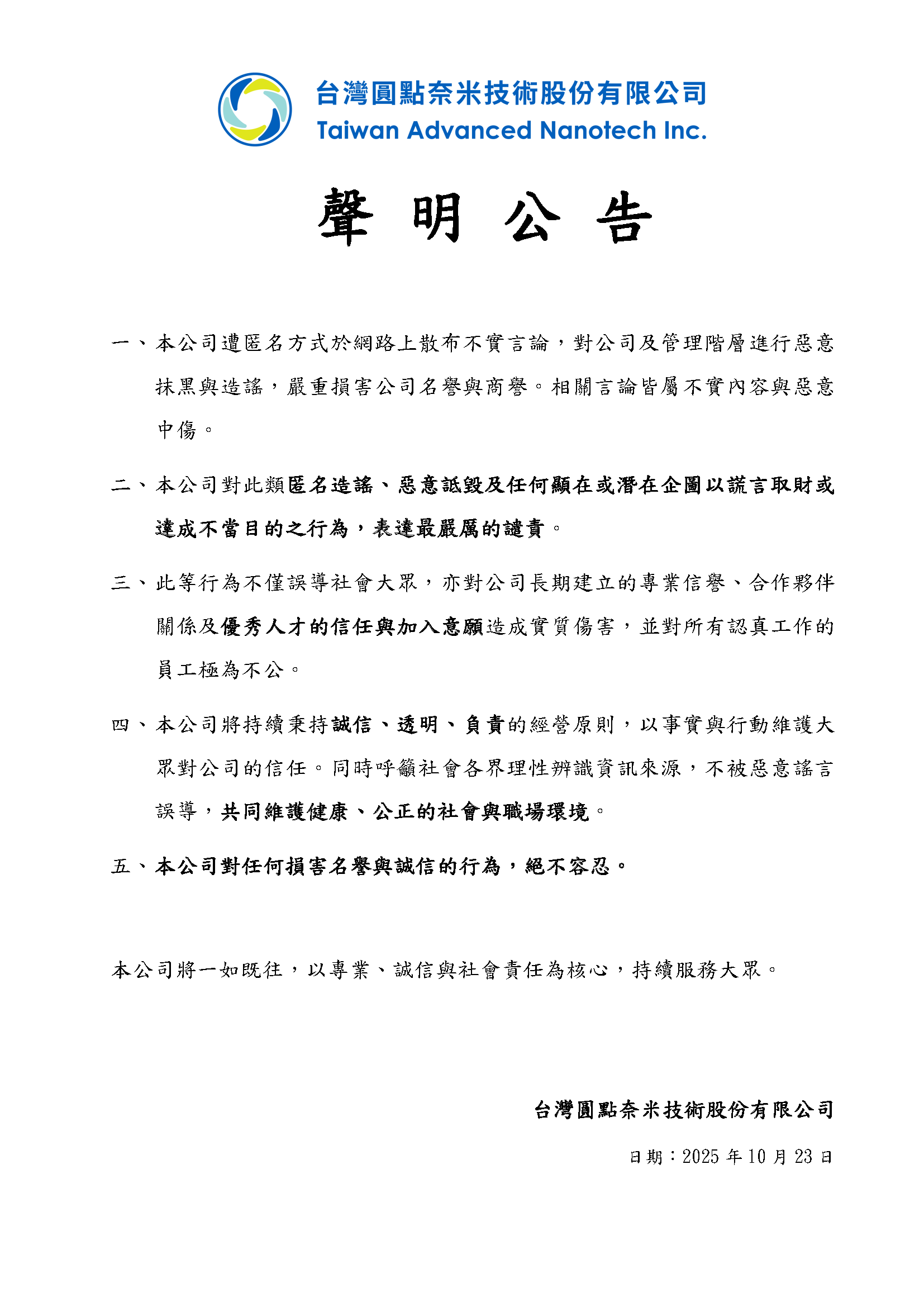 台灣圓點奈米 聲明公告